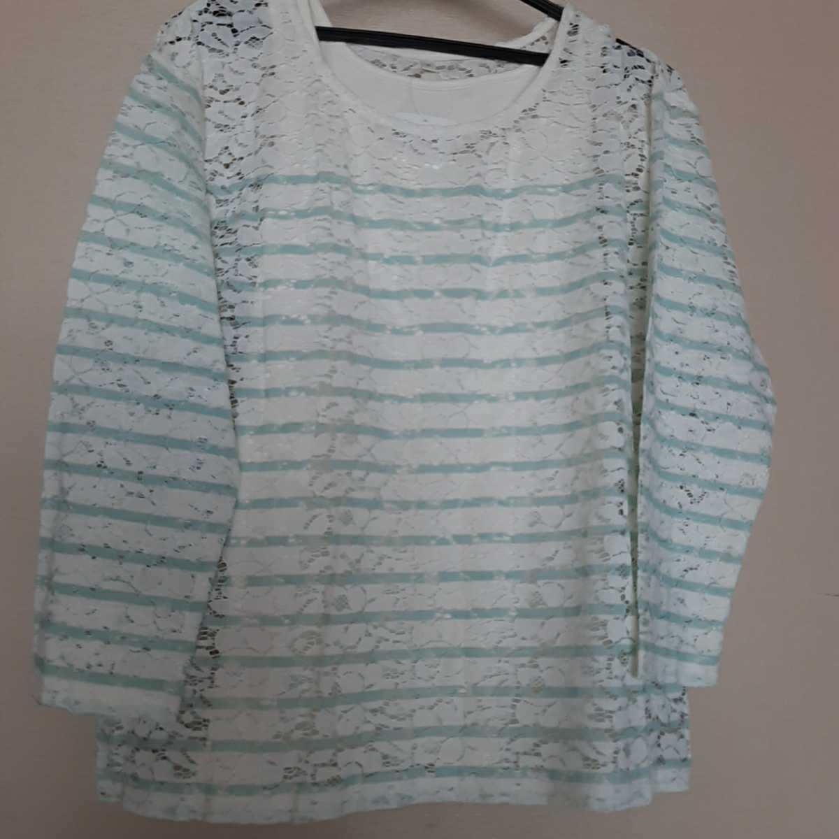 - ★さらに値下げ↓★*ベルメゾン*タンクトップ付き*ペパーミントグリーンのボーダーの透かしレースのブラウス*