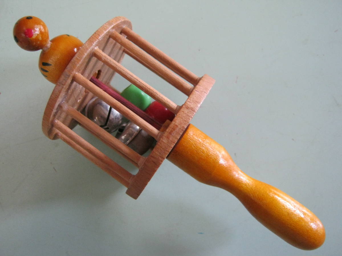 - 【鳥の形の物が上に付いた円筒形の格子の中に鈴が入っていて回転できるガラガラ(木製・手作り品)】