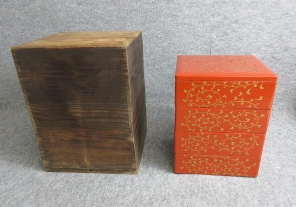 - 朱塗 総唐草 蒔絵 四段 重箱 箱入り [B29775] 高さ27cm 縦20cm 横21cm 漆器 漆芸 古玩 古美術