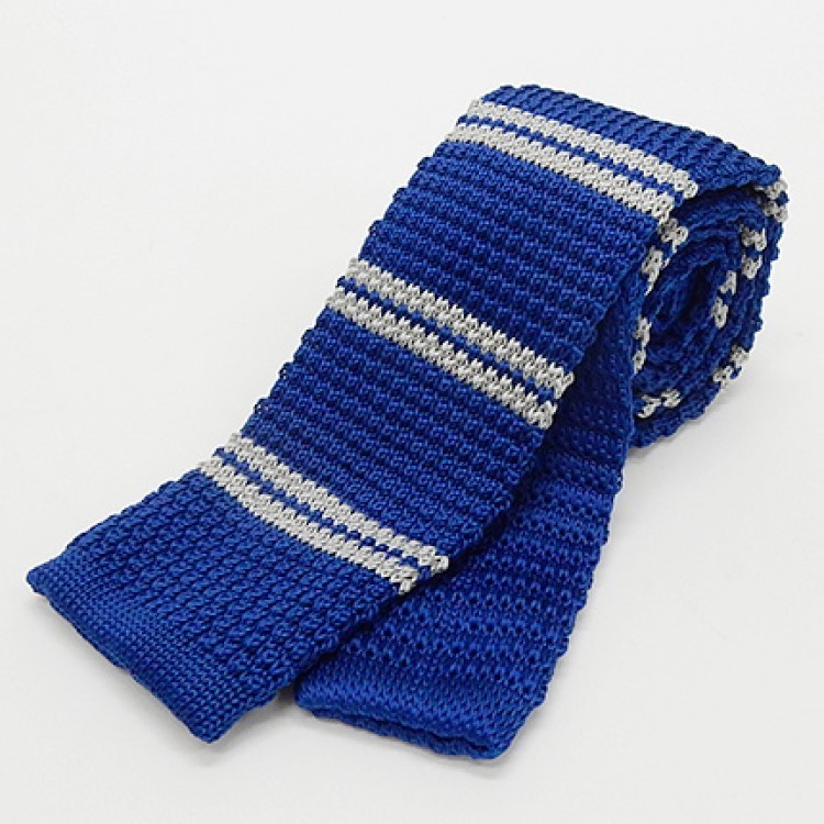 - ニットタイ スリム ネクタイ 洗濯機OK 剣先6cm 青×銀 ボーダー ポリエステル100% ナロータイ SW07-14