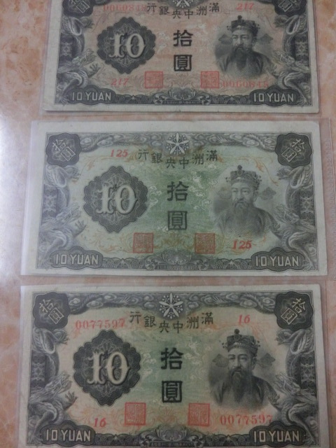 - ★ 満州中央銀行券 乙号券10円・丙号券10円・丙改券10円 3種3枚セット ★ No.366