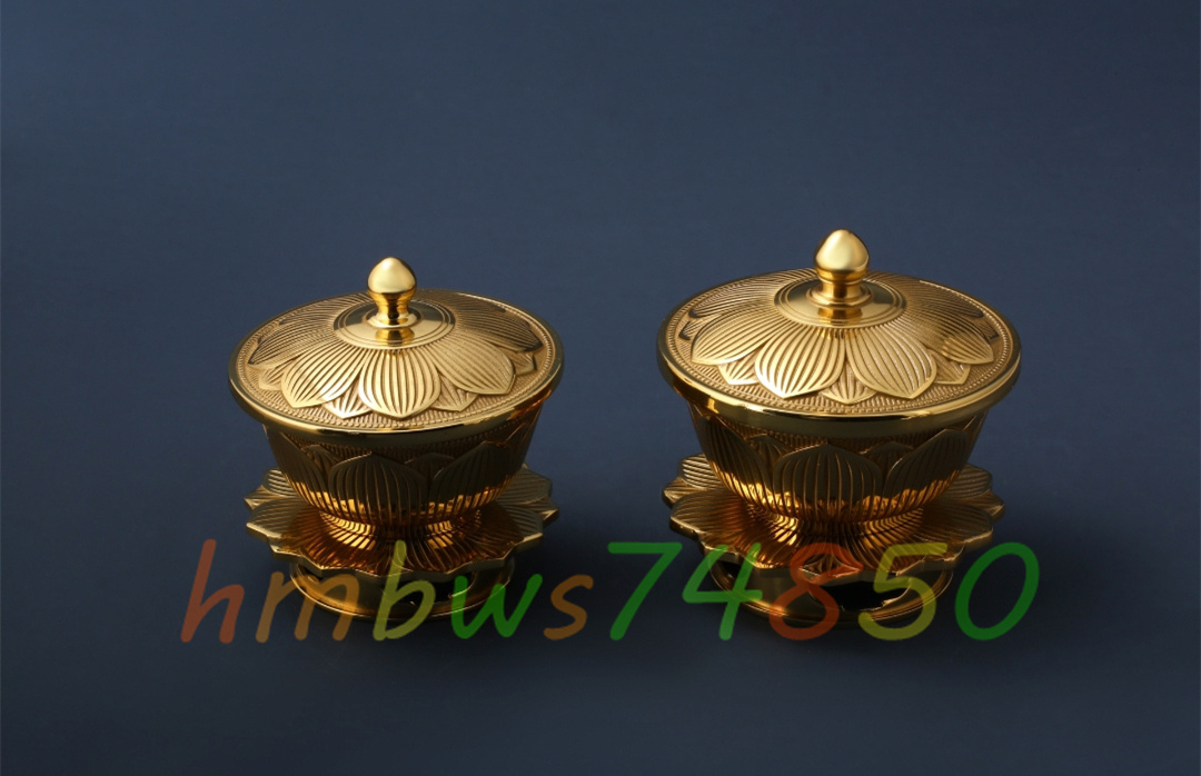 - 「密教法具 寺院仏具」真言宗 蓮華型法具 洒水器/塗香器 2点 仏具 仏教美術 筋彫り 真鍮製 磨き仕上げ 高さ9cm