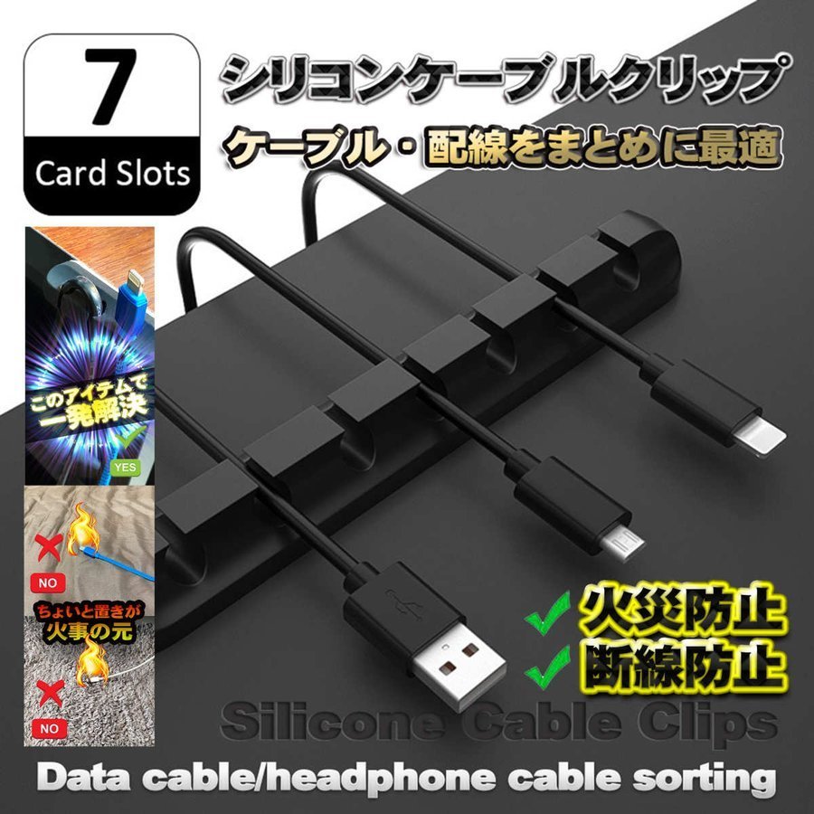 - 【7ポートタイプ】シリコンケーブルクリップ ケーブル配線の整理・火災防止・断線防止 強力両面シールでしっかり固定 【ブラック】