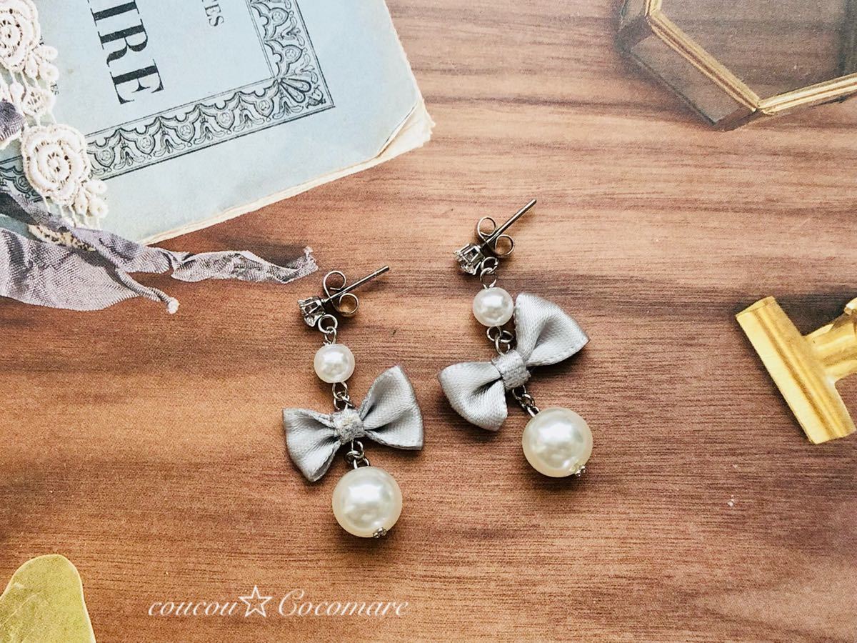 - 韓国風 リボンとパールピアス【サージカルステンレス】グレー