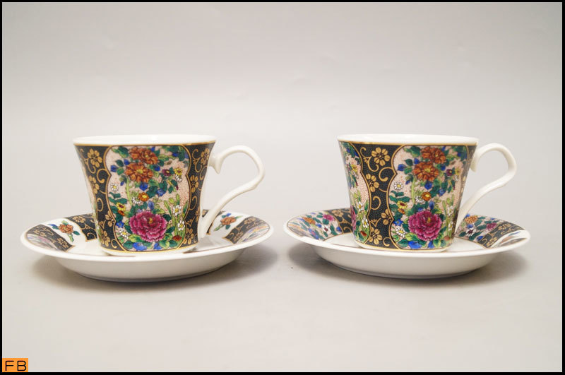 - 1136-九谷正峰◆カップ&ソーサー 2客 絵花図 金彩花唐草紋 金彩 レトロ