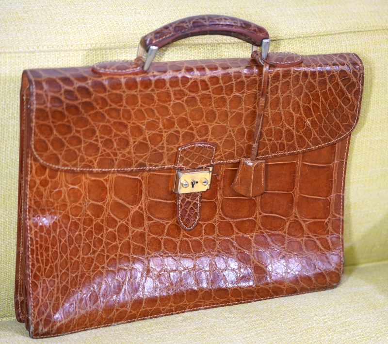 - 鍵付き リアルアリゲーター ビジネスバッグ マットクロコダイル 書類鞄 茶 ブラウン