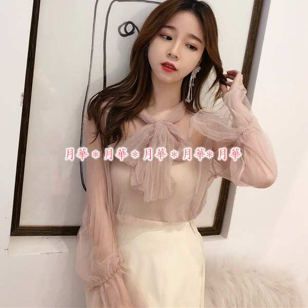 - ブラウス ピンク 即納 トップス キャミ付 レディース メッシュプリーツ シースルー 206546 リボン 大人可愛い フレアスリーブ 長袖