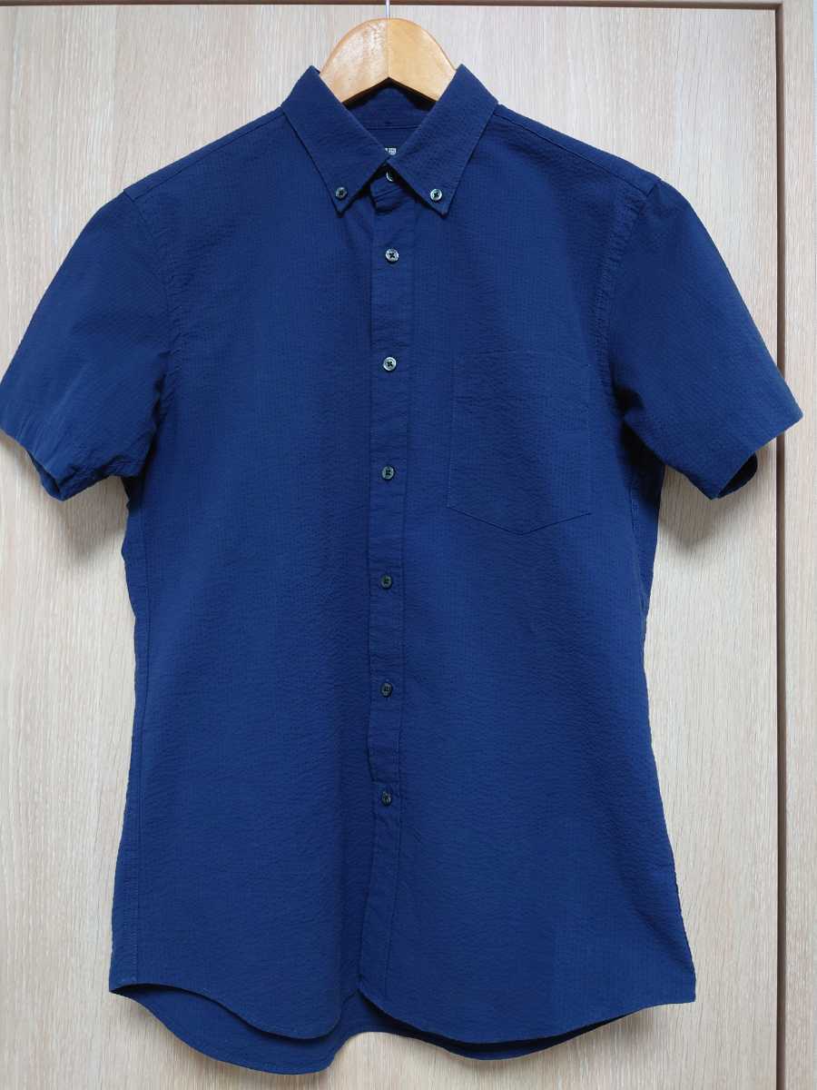 > ユニクロ シアサッカーシャツ ネイビーS 半袖ボタンダウンシャツ UNIQLO