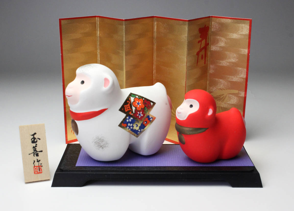 > 開運干支 紅白 申 置物 玉善作【新品 未使用 箱入り】陶器製 ペア 猿 干支置物 せともの 瀬戸焼