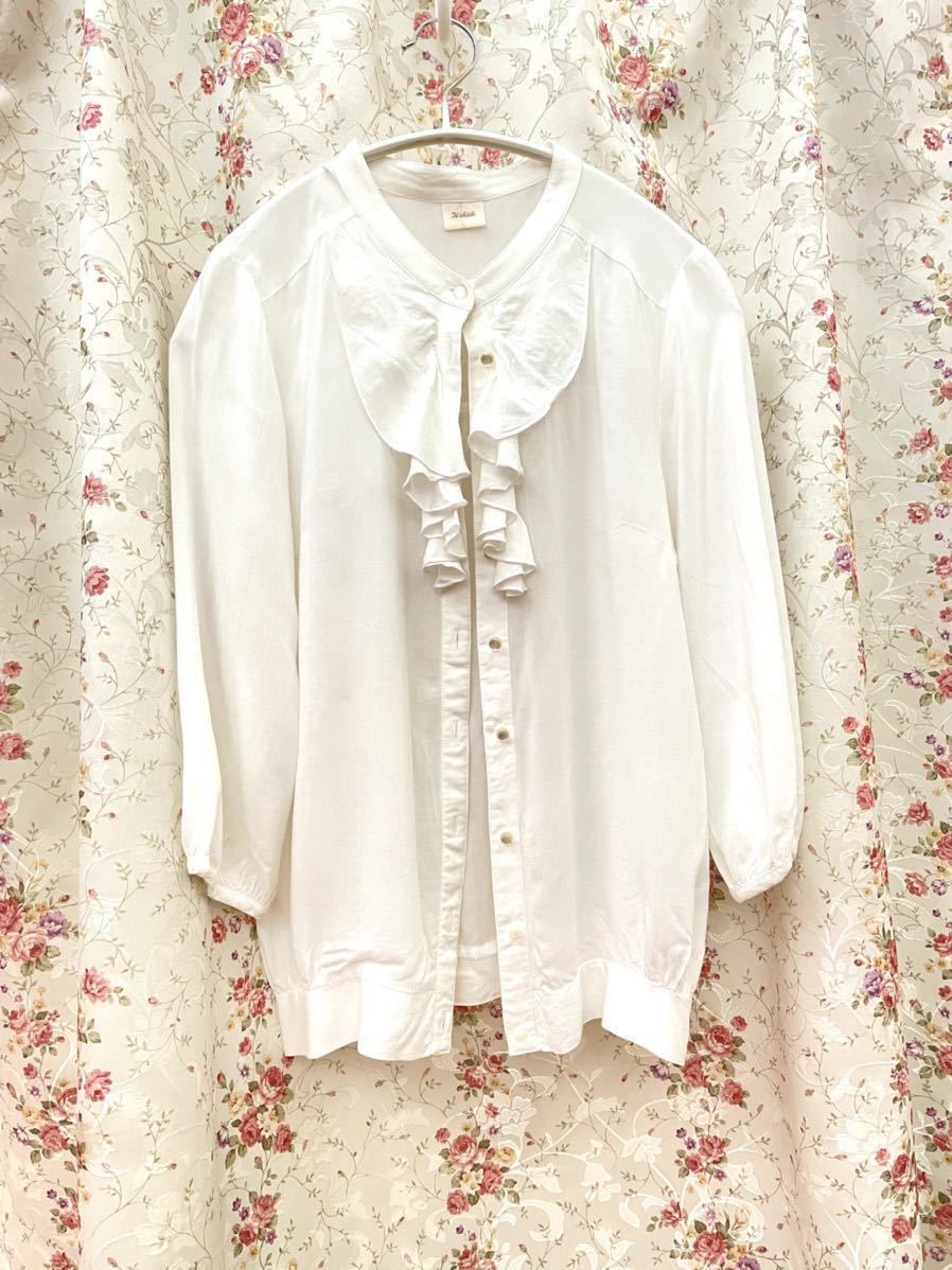 - 白 七分袖 スタンドカラー かわいいフリル かわいいボタン