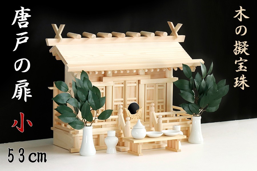 - 美しい、東濃桧 ■ 通し屋根 三社 小型 ■ 唐戸の扉 × 木の擬宝珠 ■ 神棚セット