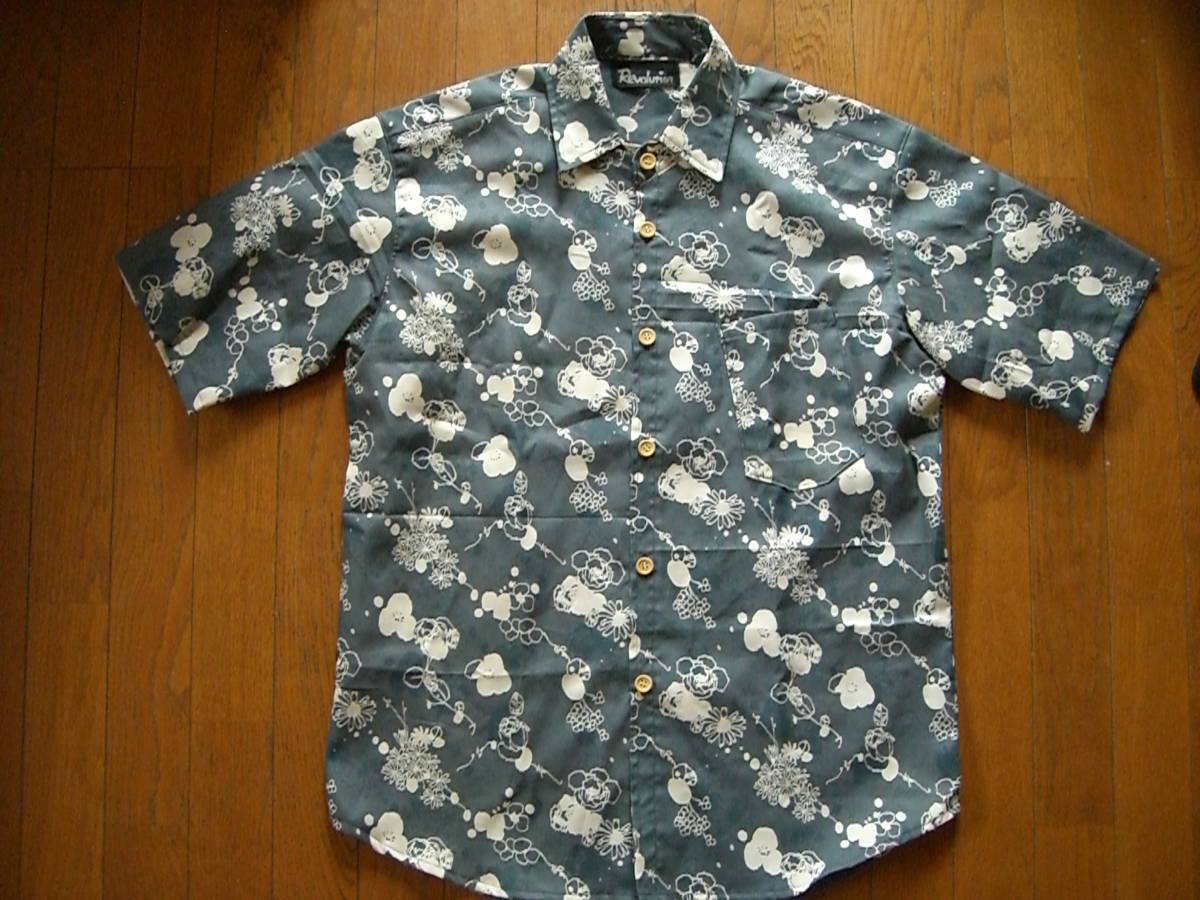 - ☆手作り☆ 和花柄半袖シャツ 薄青 L 新品 送無料あり