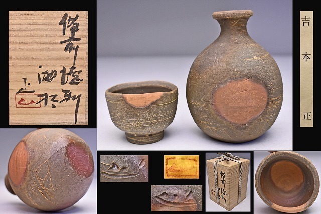 > 吉本正 ★ 備前 徳利 ぐい呑 ★共箱共布栞★珍品にして上作★師:人間国宝 藤原啓 ★ミニチュアセットの様な大きさでメロン肌 牡丹餅 見事