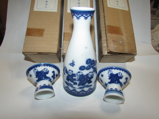 - ( 酒屋・蔵出し)清酒・名倉山・老松に遊ぶ唐子達ち(古い未使用お銚子・お猪口2客・・3セット)NO2 ・昭和レトロ・珍品・貴重 未使用