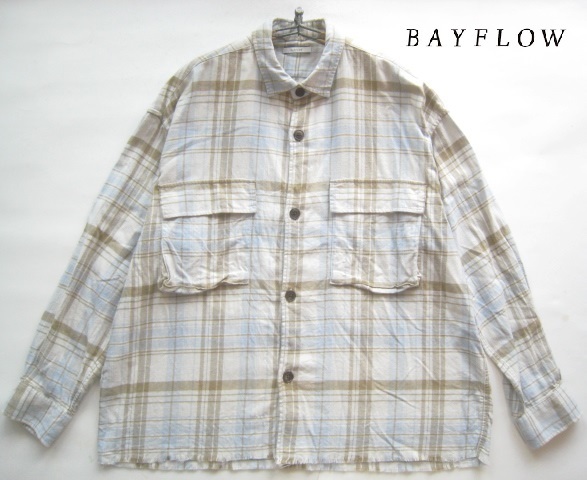 > 美品!!ベイフロー BAYFLOW*ワイドシルエット 切りっ放し加工 チェック柄コットンネルシャツ 4 実寸L