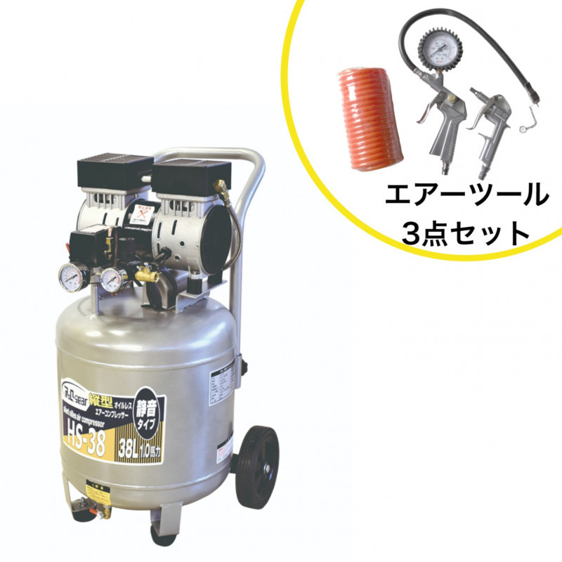 - 静音オイルレス縦型コンプレッサー 38L HS-38 エアーツール3点セット (38L/1.0馬力) ◆本州四国九州送料無料 ※沖縄・離島は配送不可※
