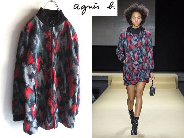 > コレクション着 agnes b. アニエスべー JAZ3 MANTEAU ジャガード織 総柄 ウールジャージー リブ ジップコート ロングジャケット T3 日本製