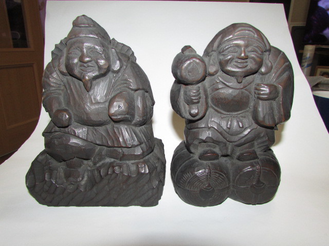 - 1000円値引・即決商品(会津若松・旧家・蔵出し・古いとろとろ味わいのある彫の良い・恵比寿様・大黒様木彫人形1対)貴重・珍品