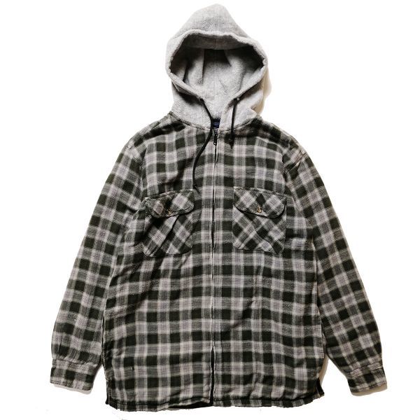 > 90's 00's ピューリタン チェック 中綿入り フード付き フランネルシャツジャケット (S) 緑×灰 フードネル 90年代 00年代 旧タグ PURITAN