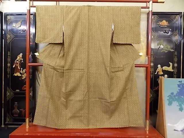 > きもの今昔4526 小紋のきもの 広衿袷手縫い仕立て 正絹浜紬染小紋 わさびグリーンとベージュ色 身丈151cm