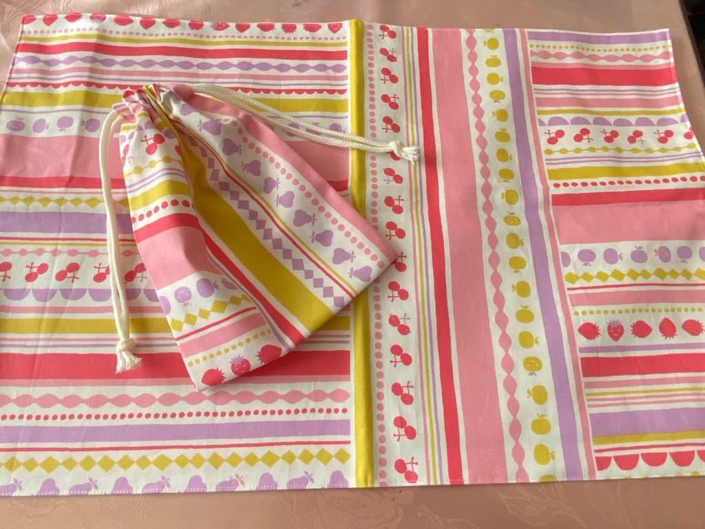 - No.158 大判裏付ランチョンマット&巾着 ハンドメイド 40x60 ピンク色フルーツ柄