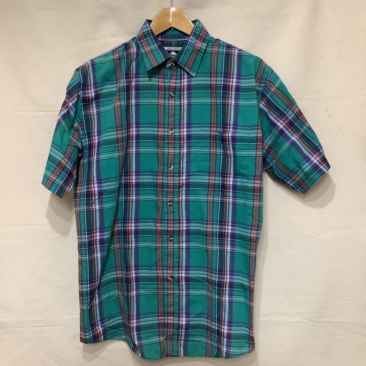 > P64.古着半袖チェックシャツアメカジUSAアメリカフリー&イージーマイフリーダムサイズMグリーンチェックボタンダウン