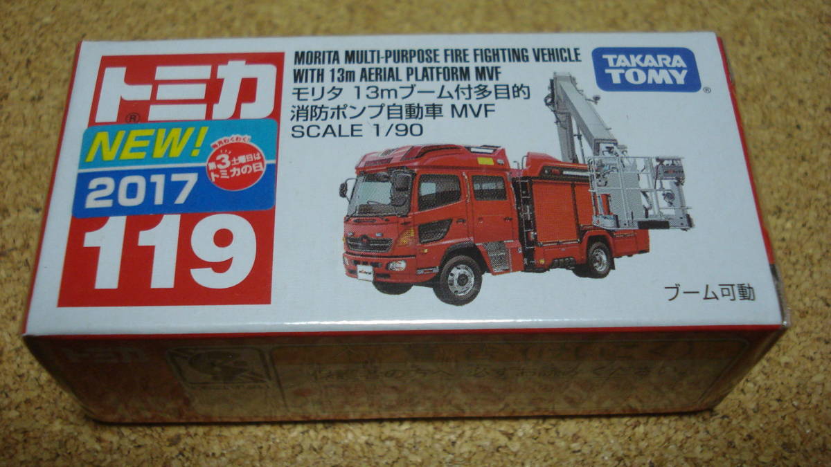 > トミカ NO.119「モリタ 13mブーム付多目的消防ポンプ自動車MVF」2017年新車/廃番品・パッケージビニール未開封品