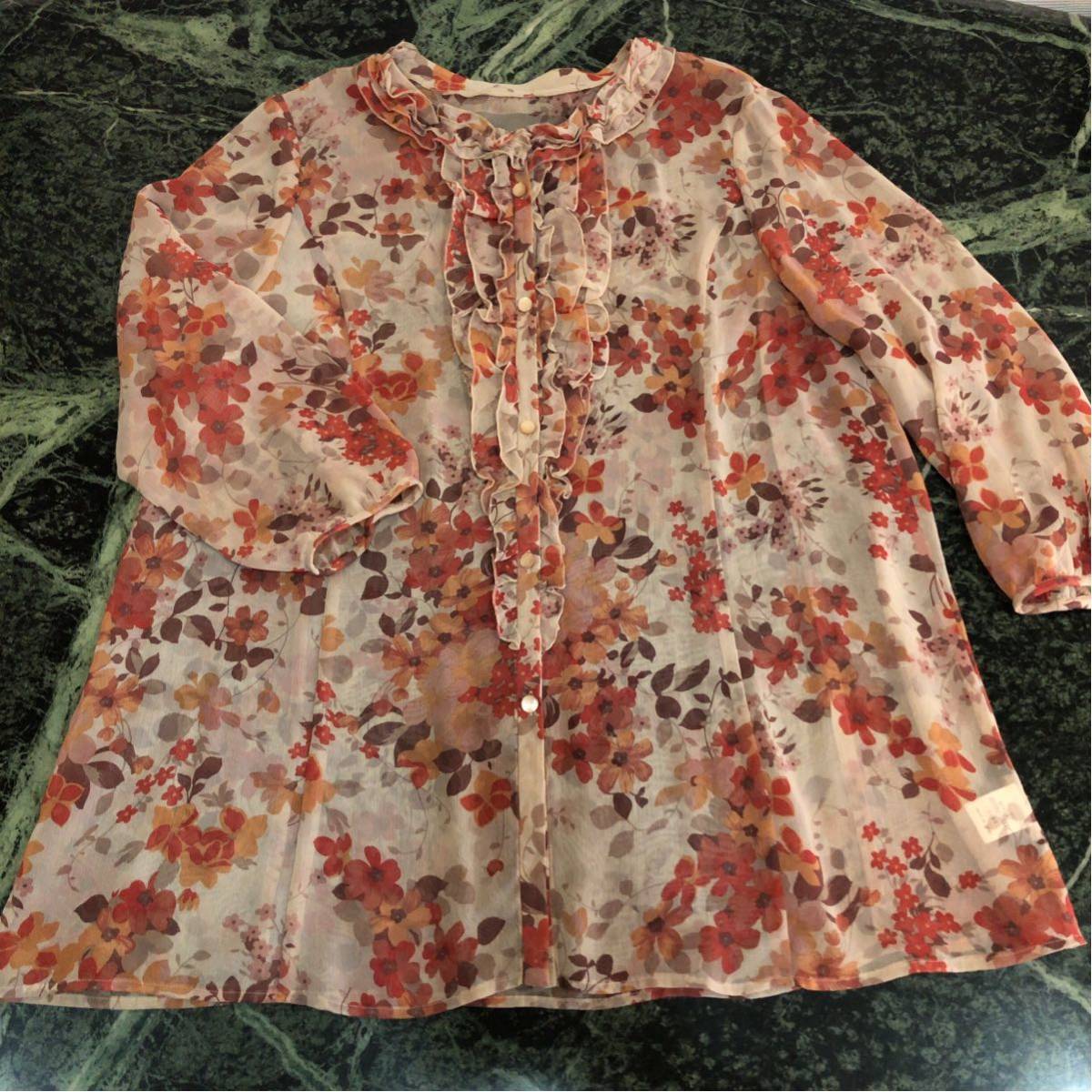 - 【新品】KORET★コレット 花柄トップス ブラウス 赤系 オレンジ系 暖色系 透け感 フリル 11号 Mサイズ〜Lサイズ