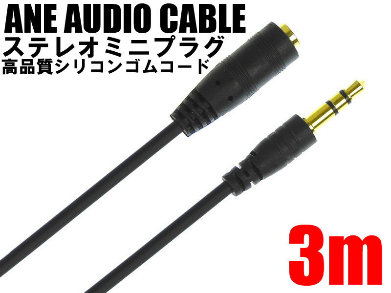 > ステレオミニプラグケーブル 直型 延長 長さ3m(300cm) ブラック 金メッキ端子 3極 高品質シリコンゴム AUX オーディオケーブル[BK6]