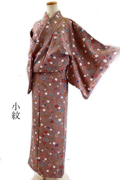 > 【送料無料】美品 小紋 小豆色 梅 縮緬 身丈158.5cm 裄丈65cm かわいい 吉祥花 袷 仕立て上がり 正絹 m-4230