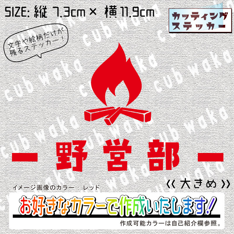 - 焚き火×野営部①ステッカー 文字絵柄だけ残るカッティングステッカー・車・カブ・二輪 CAMP・キャンプ・焚き火 リアガラス