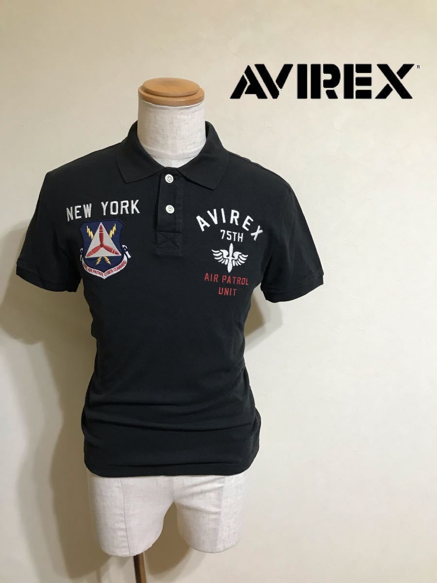 > AVIREX U.S.A アヴィレックス ミリタリー 刺繍 鹿の子 ポロシャツ トップス ブラック サイズM 半袖 黒