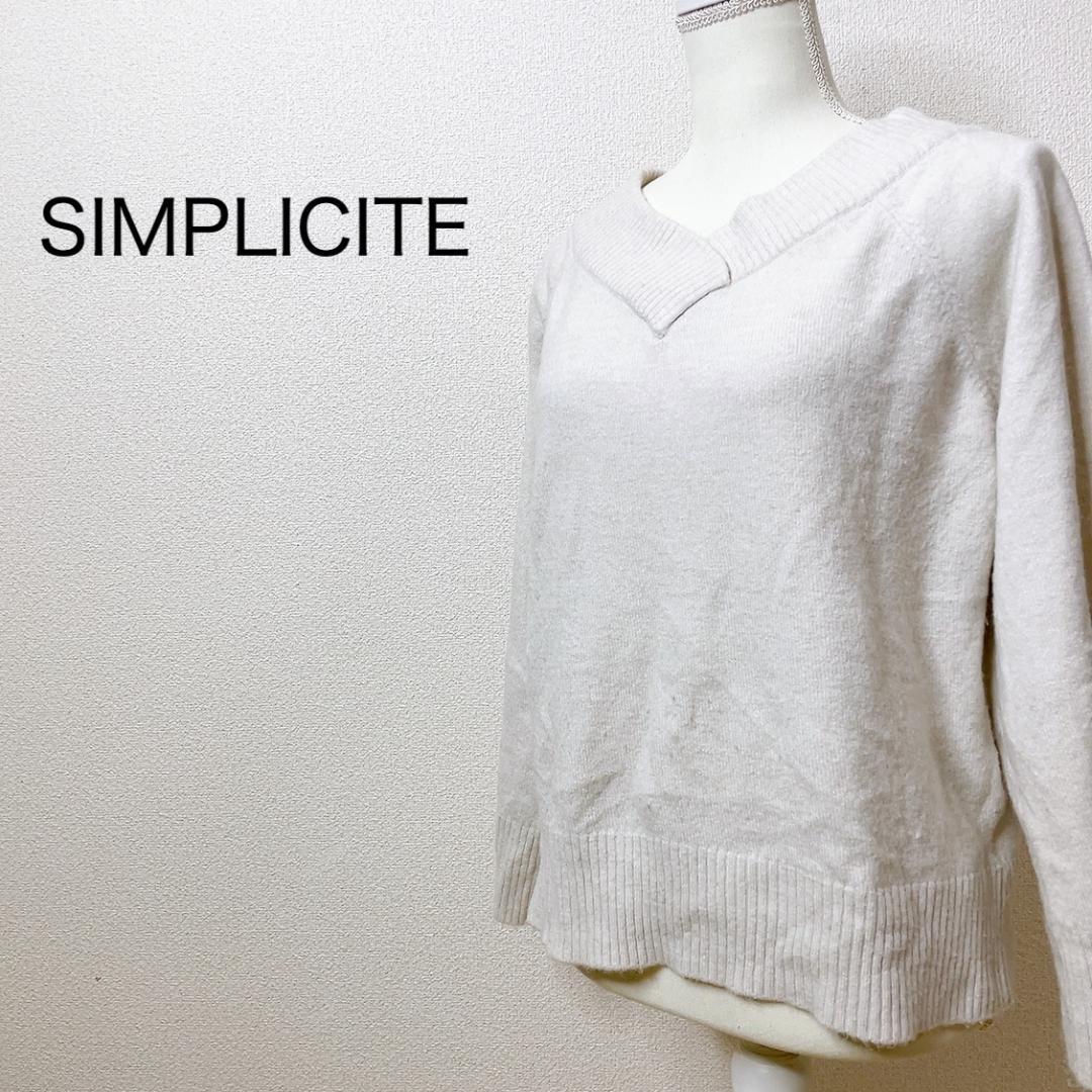 > 【SIMPLICITE】シンプリシテェ 長袖ニット クロスオーバー リブ カジュアル 大人かわいい きれいめ 春秋冬 レディース アイボリー