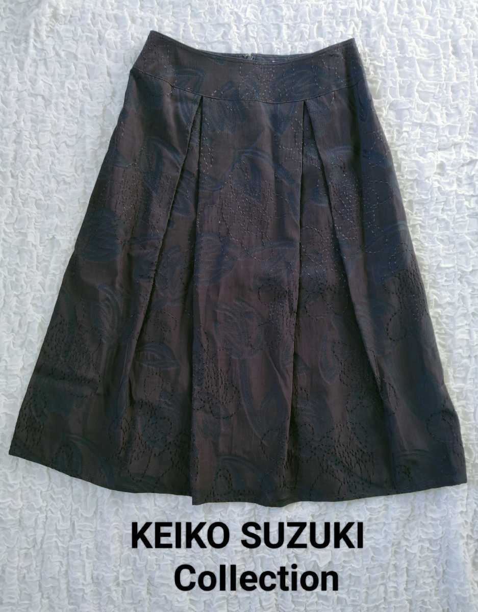 > KEIKO SUZUKI COLLECTION*ケイコ スズキ コレクション*膝下丈*ミモレ丈*フレアースカート*タックスカート*紫*ステッチ刺繍*日本製*Lサイズ