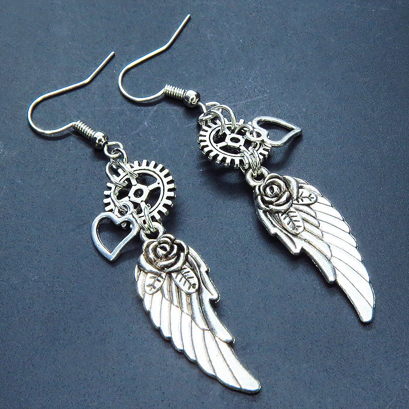 - アンティークシルバー 天使の翼と歯車を組合せたスチームパンク風ピアス オープンハート サージカル可