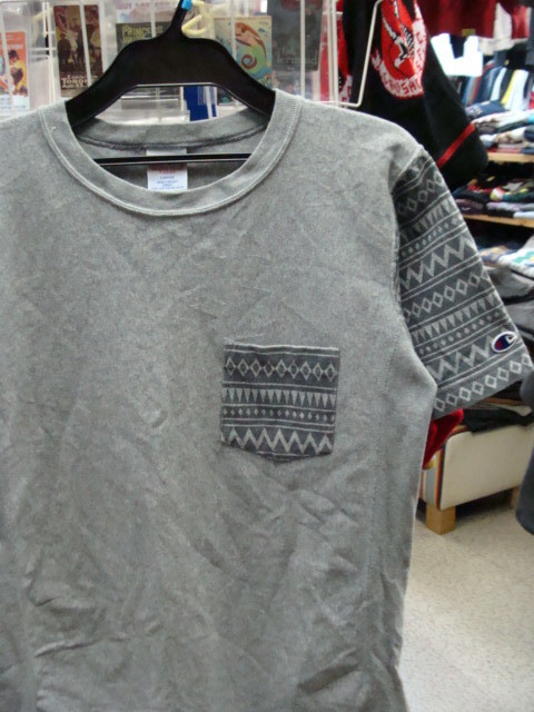> Champion チャンピオン REVERSE WEAVE 灰×柄 半袖Tシャツ (L)