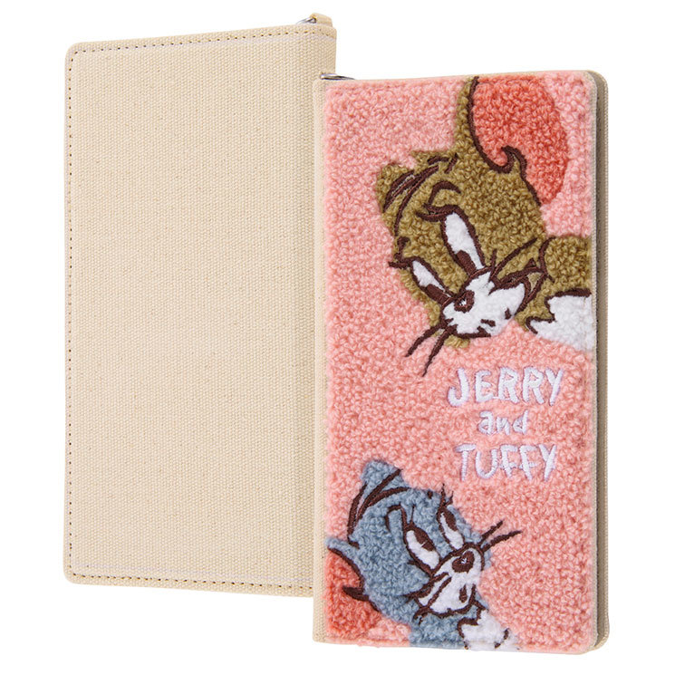 > 多機種対応 手帳型 スマホケース もこもこ トムとジェリー タフィー Lサイズ かわいい おしゃれ ミラー付 カード ポケット 収納 タオル生地