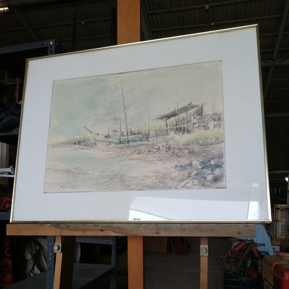 - アートペン 1990 船 川 海 ボート 額入 金縁 (約55×73cm) 絵画