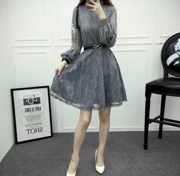 - 【L グレー 色】ベルト付き スタンドカラー レースフローラル柄 Aライン