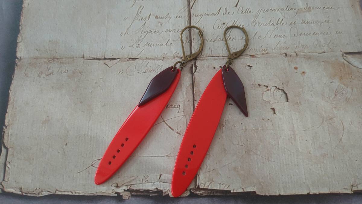 - 濃ピンク×紫 細長い楕円・デザインピアス