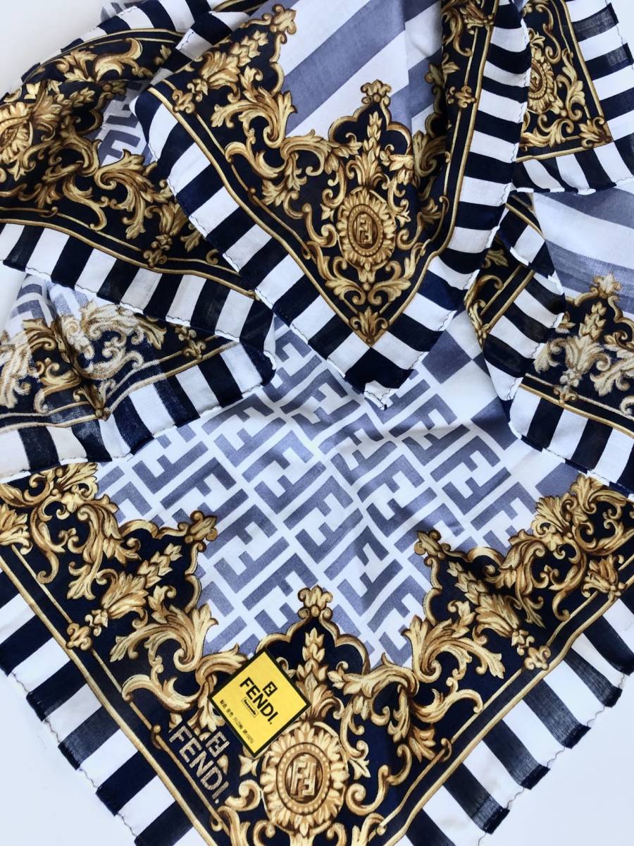 - 【レア柄】 フェンディ FENDI ◆大判ハンカチ ズッカ柄 ストライプ織りミニスカーフ★膝掛け(0421E42500)