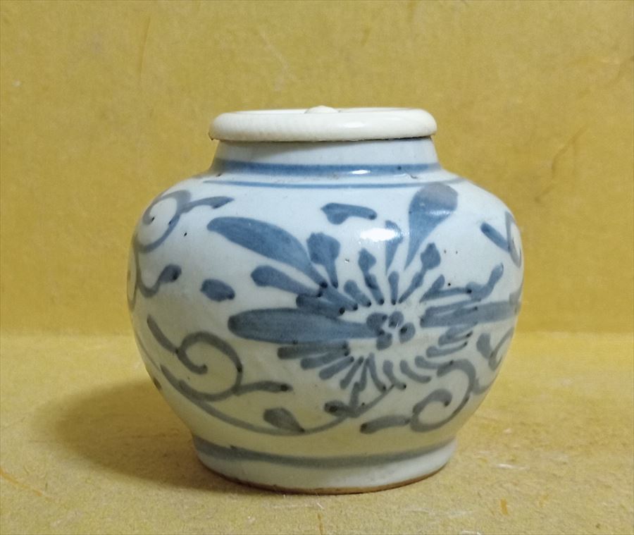 明時代 染付 丸壺 提灯壺 満月壺 染付 花文 利休式蓋 朝鮮古陶 李朝 時代保証 本物保証