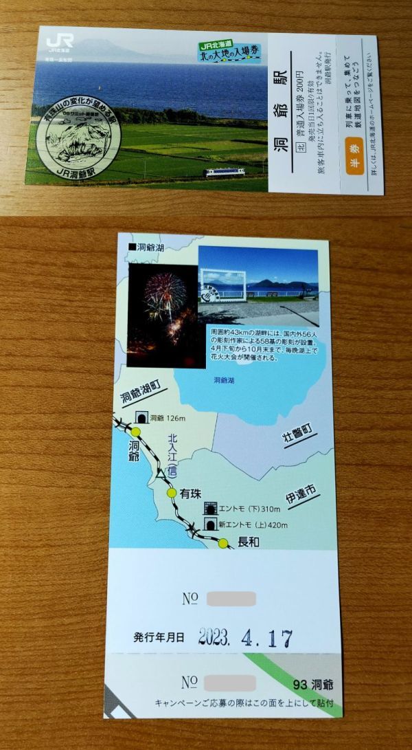 - ◆JR北海道◆北の大地の入場券 洞爺駅 日付「2023年4月」 室蘭本線 キハ40系(日高色)