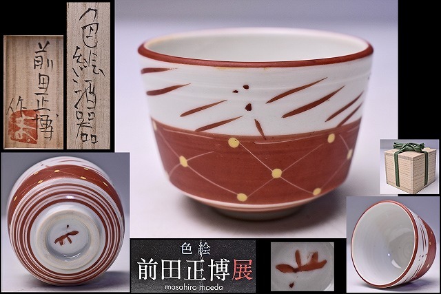 > 前田正博 ★ 色絵 ぐい呑 ★ 共箱 個展栞 ★ 赤とんぼの様な愛らしい赤絵 ★ 酒器 ★