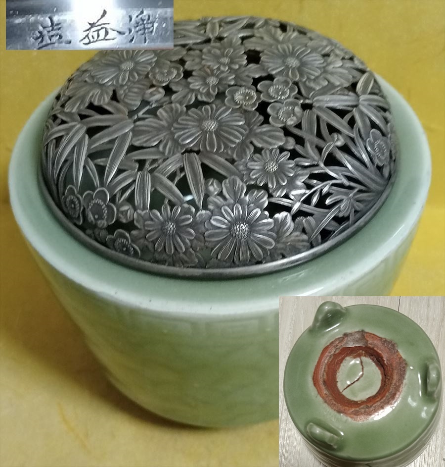 明代 龍泉窯 梅子青 香炉 浄益 純銀 蓋 時代保証 本物保証 古箱