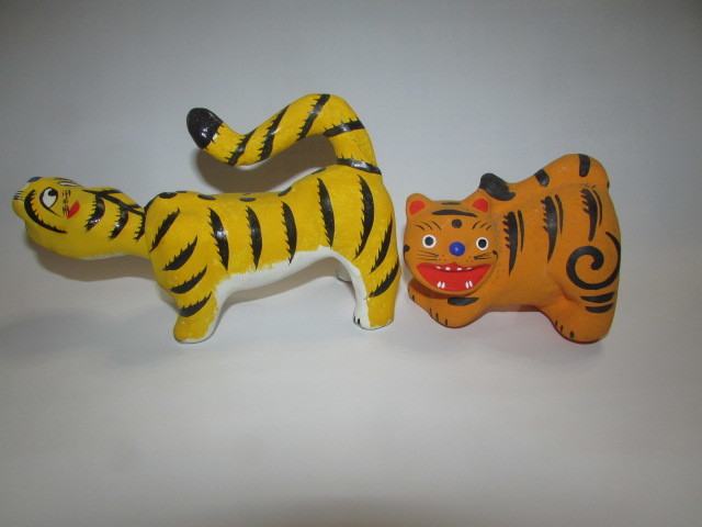 - 即決商品( 旧家・蔵出し)(レトロな三春張り子人形・首振り虎と可愛い顔の虎・2体 )貴重・珍品