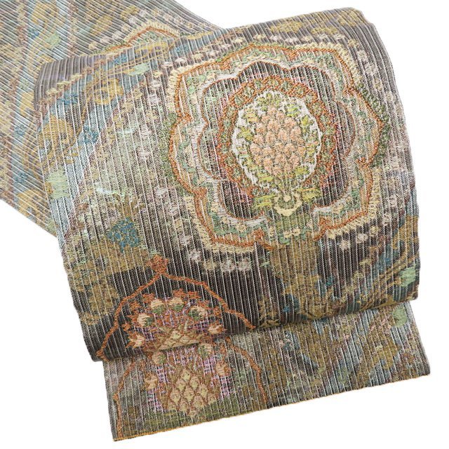 > 袋帯 中古 リサイクル 正絹 フォーマル 仕立て上がり 六通 華文 箔糸 茶系色 多色 金 きもの北條 A845-17