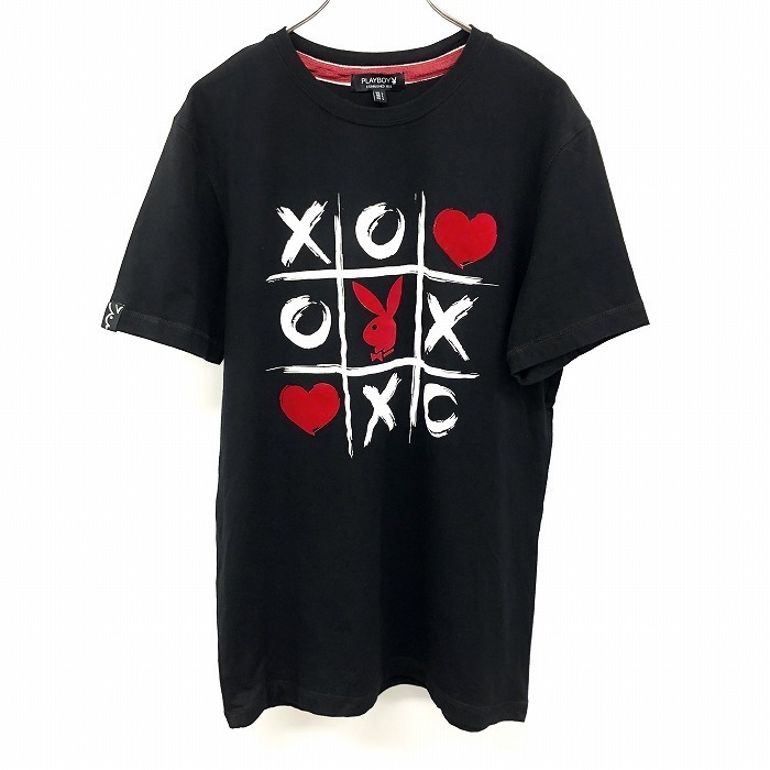 > プレイボーイ PLAYBOY Tシャツ カットソー ストレッチ 〇× ハート 一部フロッキープリント 丸首 半袖 L ブラック 黒 レディース