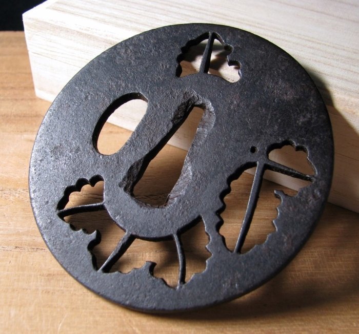 - 時代武具 鉄地 葉透かし鍔 桐箱付 江戸時代/鐔/23f007