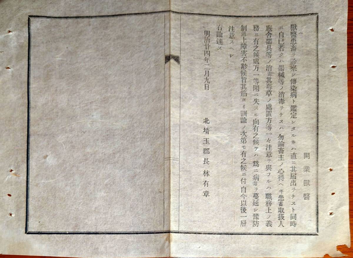 - f23062006〇明治布告 開業獣医へ 獣医患畜を診察し伝染病と鑑定したるときは消毒 病毒蔓延防止 明治24年 北埼玉郡〇和本古書古文書